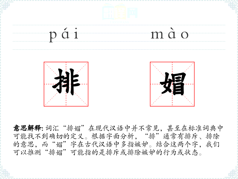 “媢”字在古代汉语中多指嫉妒,如《说文解字》中解释为“妒也”。而“排”字自古就有排斥、排除的意思。这两个字的结合可能是后来创造的词汇,用于特定语境中描述处理嫉妒的行为。