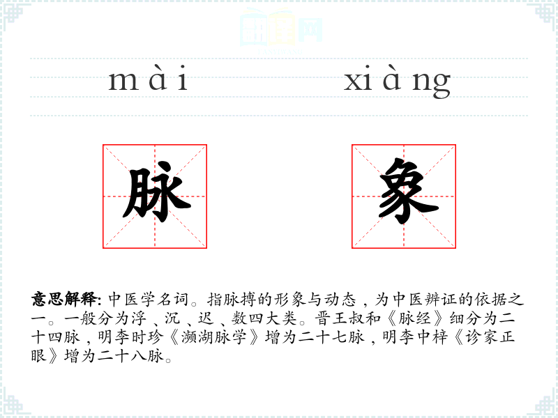 中医学名词。指脉搏的形象与动态﹐为中医辨证的依据之一。一般分为浮﹑沉﹑迟﹑数四大类。晋王叔和《脉经》细分为二十四脉﹐明李时珍《濒湖脉学》增为二十七脉﹐明李中梓《诊家正眼》增为二十八脉。