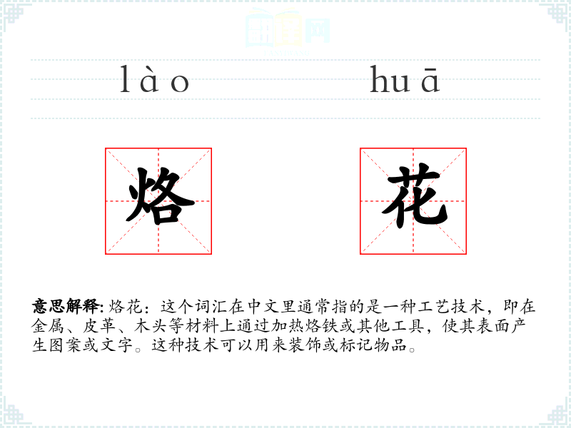 烙花:这个词汇在中文里通常指的是一种工艺技术,即在金属、皮革、木头等材料上通过加热烙铁或其他工具,使其表面产生图案或文字。这种技术可以用来装饰或标记物品。