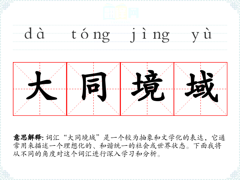 词汇“大同境域”是一个较为抽象和文学化的表达,它通常用来描述一个理想化的、和谐统一的社会或世界状态。下面我将从不同的角度对这个词汇进行深入学*和分析。