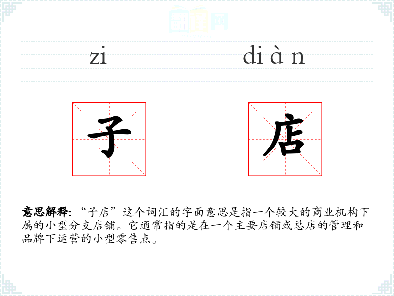 在**,随着经济的快速发展和城市化进程的加快,连锁经营模式越来越普遍,因此“子店”这个词汇在商业领域中变得尤为重要。它反映了现代商业组织结构的一种特点。