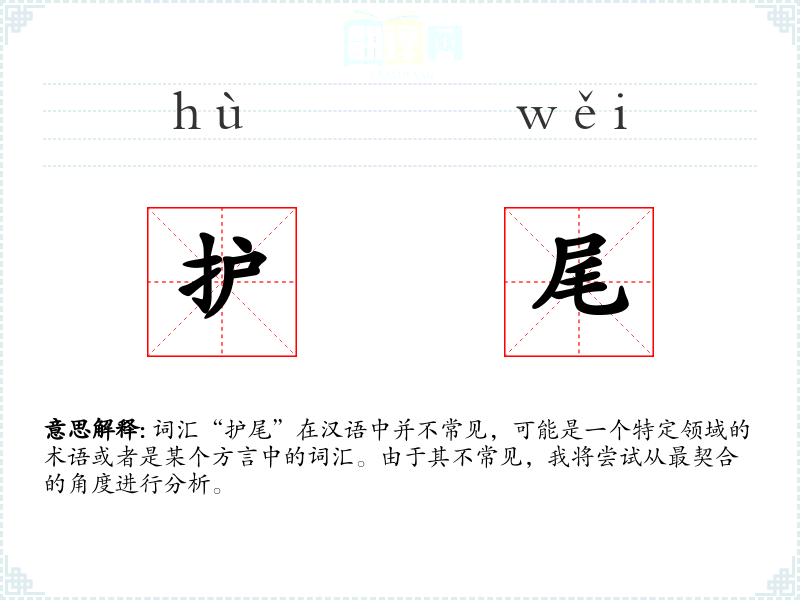 词汇“护尾”在汉语中并不常见,可能是一个特定领域的术语或者是某个方言中的词汇。由于其不常见,我将尝试从最契合的角度进行分析。