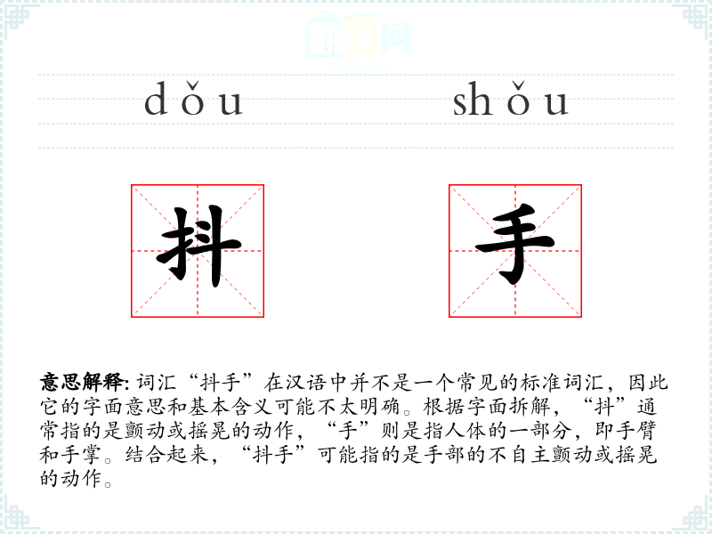 词汇“抖手”在汉语中并不是一个常见的标准词汇,因此它的字面意思和基本含义可能不太明确。根据字面拆解,“抖”通常指的是颤动或摇晃的动作,“手”则是指人体的一部分,即手臂和手掌。结合起来,“抖手”可能指的是手部的不自主颤动或摇晃的动作。