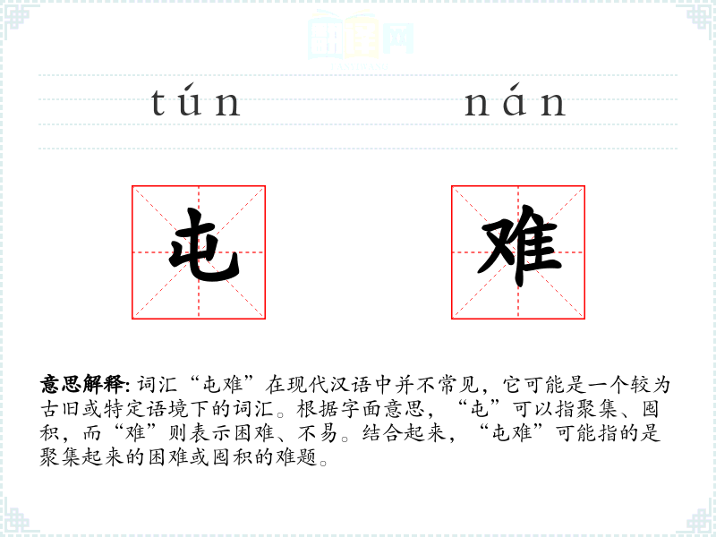 - 理解:屯难是一个描述困难聚集的词汇,虽然在现代汉语中不常见,但在特定语境下仍具有一定的表达力。