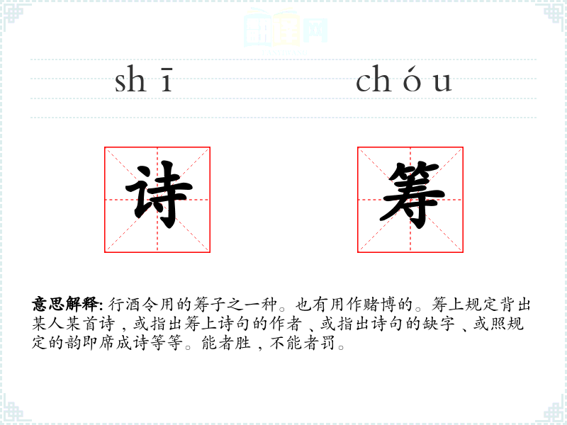 行酒令用的筹子之一种。也有用作赌博的。筹上规定背出某人某首诗﹐或指出筹上诗句的作者﹑或指出诗句的缺字﹑或照规定的韵即席成诗等等。能者胜﹐不能者罚。