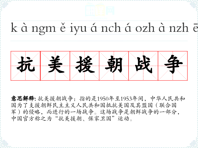 同义词:朝鲜战争(参战部分)、抗美援朝 反义词**:和平谈判、停战协议