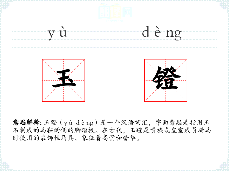 玉蹬(yù dèng)是一个汉语词汇,字面意思是指用玉石制成的马鞍两侧的脚踏板。在古代,玉蹬是贵族或皇室成员骑马时使用的装饰性马具,象征着高贵和奢华。