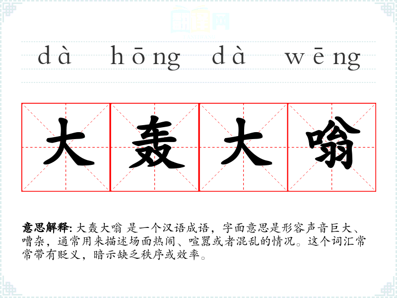 大轰大嗡 是一个汉语成语,字面意思是形容声音巨大、嘈杂,通常用来描述场面热闹、喧嚣或者混乱的情况。这个词汇常常带有贬义,暗示缺乏秩序或效率。