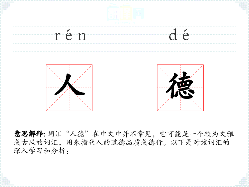 词汇“人德”在中文中并不常见,它可能是一个较为文雅或古风的词汇,用来指代人的道德品质或德行。以下是对该词汇的深入学*和分析: