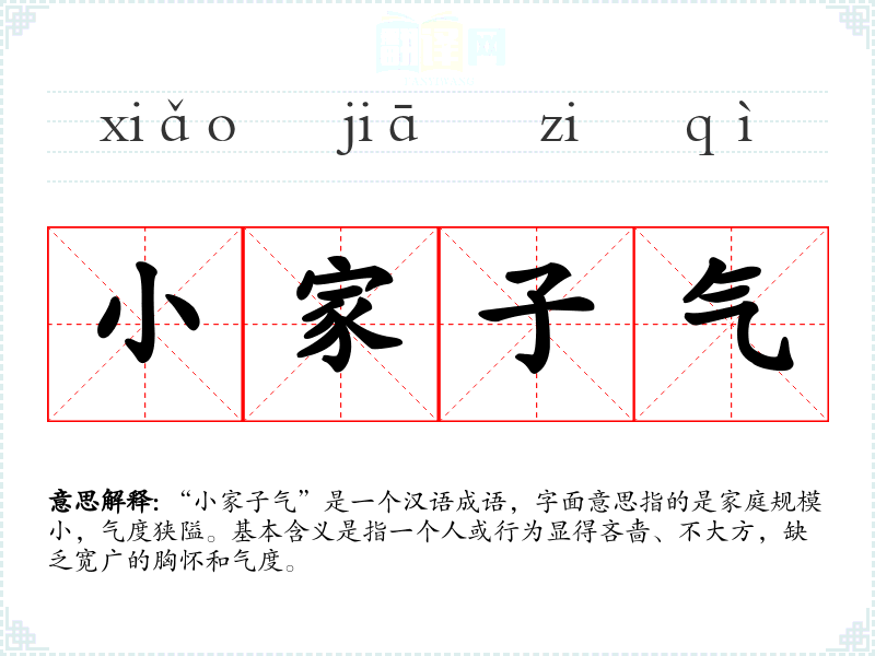 “小家子气”是一个汉语成语,字面意思指的是家庭规模小,气度狭隘。基本含义是指一个人或行为显得吝啬、不大方,缺乏宽广的胸怀和气度。