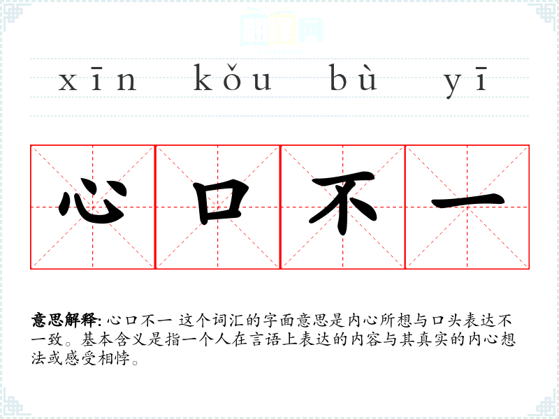 心口不一 这个词汇的字面意思是内心所想与口头表达不一致。基本含义是指一个人在言语上表达的内容与其真实的内心想法或感受相悖。