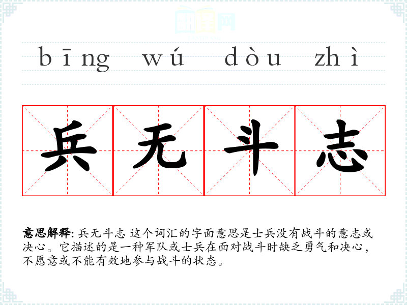 兵无斗志 这个词汇的字面意思是士兵没有战斗的意志或决心。它描述的是一种军队或士兵在面对战斗时缺乏勇气和决心,不愿意或不能有效地参与战斗的状态。