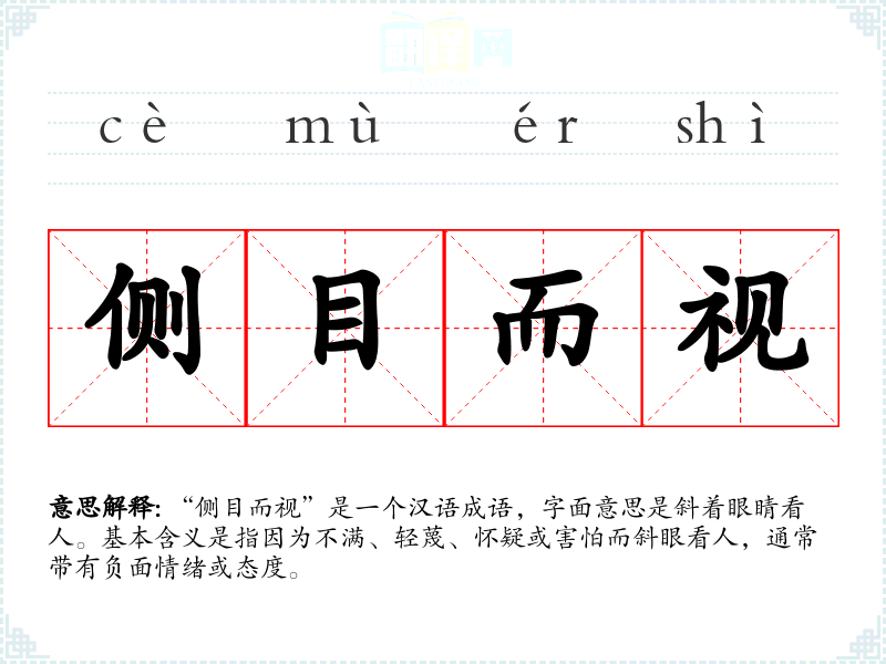 “侧目而视”是一个汉语成语,字面意思是斜着眼睛看人。基本含义是指因为不满、轻蔑、怀疑或害怕而斜眼看人,通常带有负面情绪或态度。