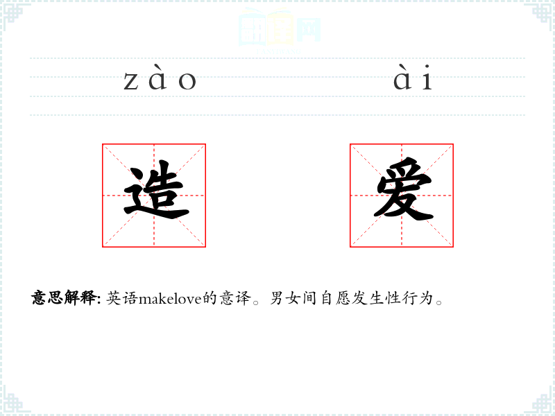 英语makelove的意译。男女间自愿发生性行为。