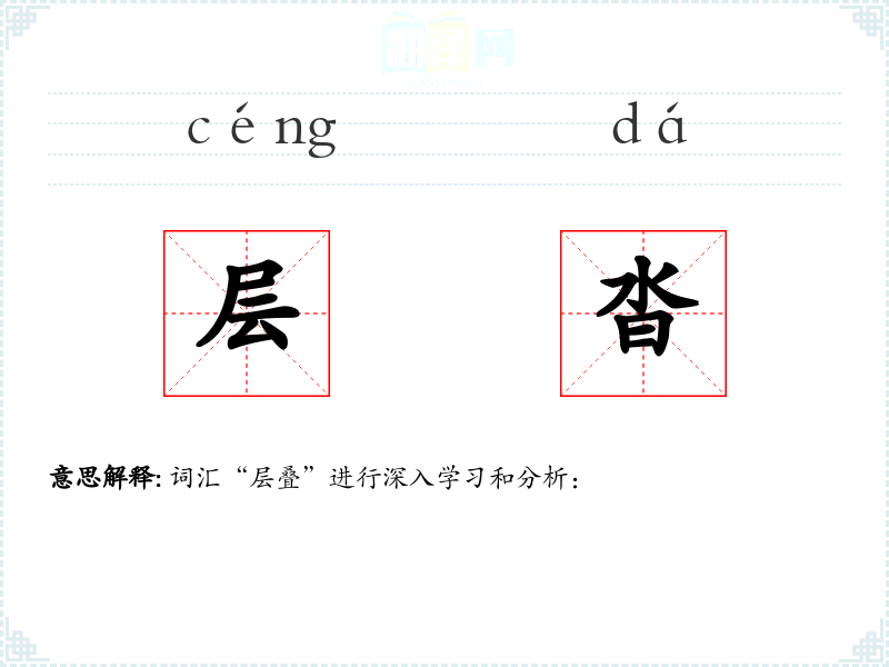 “层叠”由“层”和“叠”两个字组成,“层”指层次,“叠”指堆叠。这个词汇在古代汉语中已有使用,随着时间的推移,其含义和用法基本保持稳定。