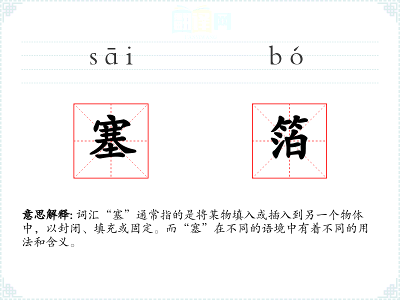 基本定义: “塞”字面意思是指将某物填入或插入到另一个物体中,以封闭、填充或固定。它可以是动词,也可以是名词。