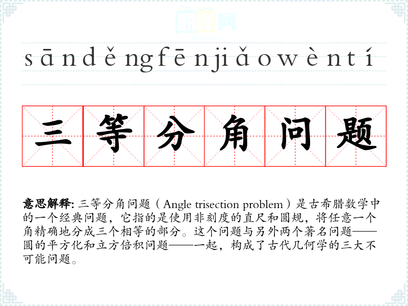 三等分角问题的词源直接来源于其数学定义,即“将一个角分成三等份”。随着数学的发展,这个问题逐渐被认识到是不可解的,但其历史和哲学意义仍然被广泛讨论。