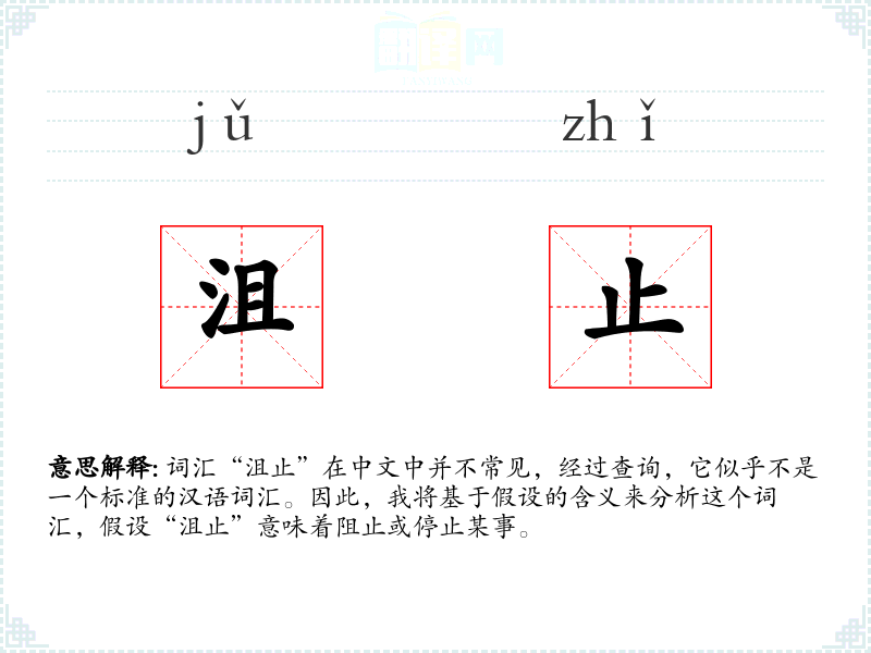 词汇“沮止”在中文中并不常见,经过查询,它似乎不是一个标准的汉语词汇。因此,我将基于假设的含义来分析这个词汇,假设“沮止”意味着阻止或停止某事。