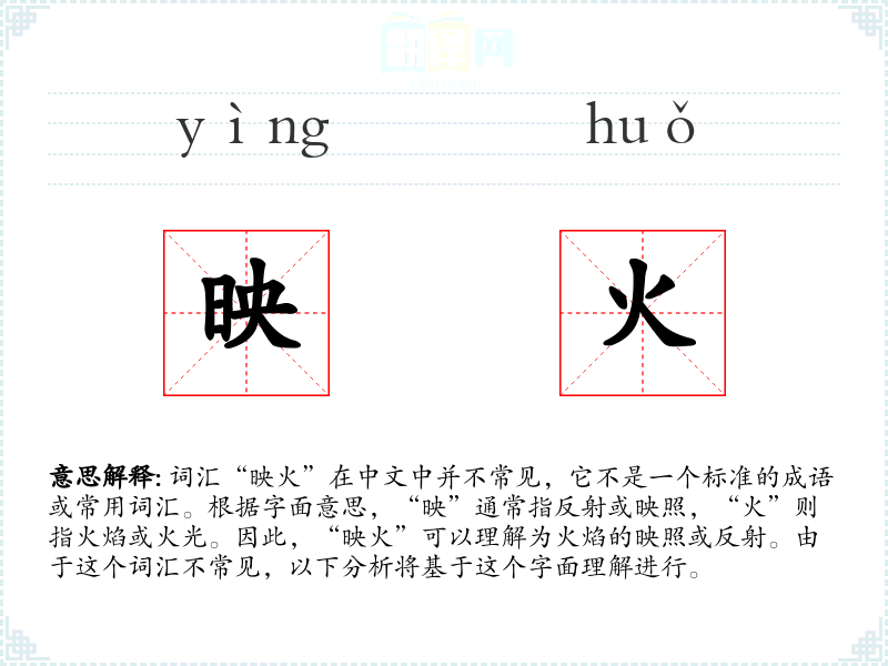 词汇“映火”在中文中并不常见,它不是一个标准的成语或常用词汇。根据字面意思,“映”通常指反射或映照,“火”则指火焰或火光。因此,“映火”可以理解为火焰的映照或反射。由于这个词汇不常见,以下分析将基于这个字面理解进行。