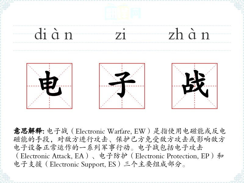 电子战(Electronic Warfare, EW)是指使用电磁能或反电磁能的手段,对敌方进行攻击、保护己方免受敌方攻击或影响敌方电子设备正常运作的一系列军事行动。电子战包括电子攻击(Electronic Attack, EA)、电子防护(Electronic Protection, EP)和电子支援(Electronic Support, ES)三个主要组成部分。
