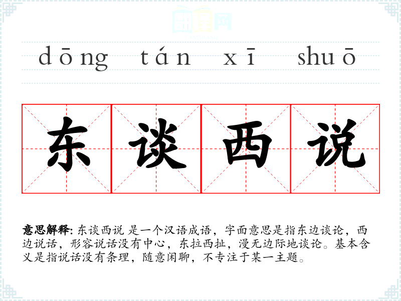 东谈西说 是一个汉语成语,字面意思是指东边谈论,西边说话,形容说话没有中心,东拉西扯,漫无边际地谈论。基本含义是指说话没有条理,随意闲聊,不专注于某一主题。