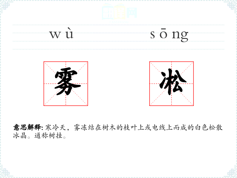 寒冷天,雾冻结在树木的枝叶上或电线上而成的白色松散冰晶。通称树挂。