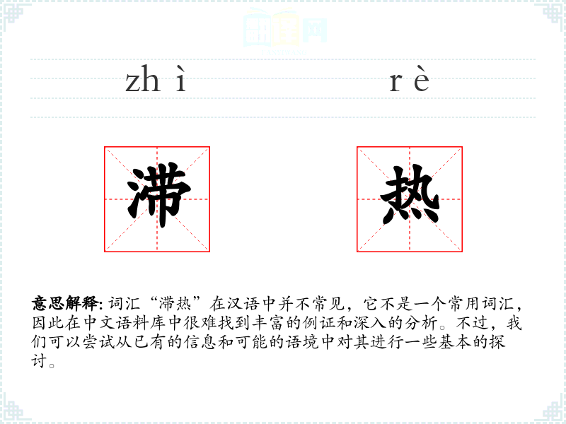 词汇“滞热”在汉语中并不常见,它不是一个常用词汇,因此在中文语料库中很难找到丰富的例证和深入的分析。不过,我们可以尝试从已有的信息和可能的语境中对其进行一些基本的探讨。