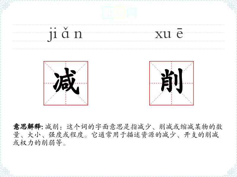 减削:这个词的字面意思是指减少、削减或缩减某物的数量、大小、强度或程度。它通常用于描述资源的减少、开支的削减或权力的削弱等。
