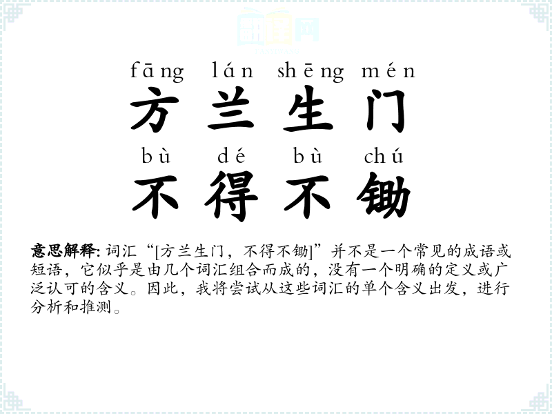 “方兰生门,不得不锄”这个词组的不明确性使其难以进行深入分析。它可能是一个特定语境下的创造性表达,需要更多的上下文信息才能准确理解其含义。在语言学*和表达中,了解词汇的准确含义和使用背景是非常重要的。