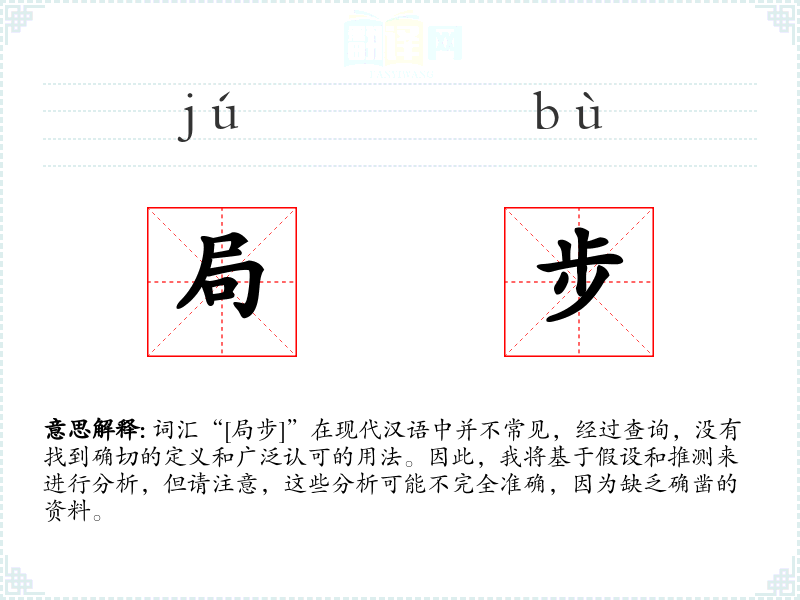 词汇“[局步]”在现代汉语中并不常见,经过查询,没有找到确切的定义和广泛认可的用法。因此,我将基于假设和推测来进行分析,但请注意,这些分析可能不完全准确,因为缺乏确凿的资料。