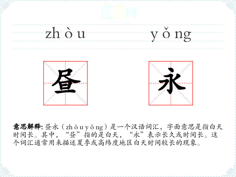 昼永(zhòu yǒng)是一个汉语词汇,字面意思是指白天时间长。其中,“昼”指的是白天,“永”表示长久或时间长。这个词汇通常用来描述夏季或高纬度地区白天时间较长的现象。
