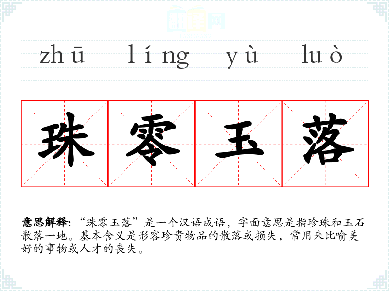 “珠零玉落”的词源较为明确,由“珠”和“玉”两个字组成,分别代表珍珠和玉石,这两个字在古代汉语中都是珍贵物品的象征。成语的形成和使用,反映了古代人们对珍贵物品的重视和对美好事物丧失的哀叹。