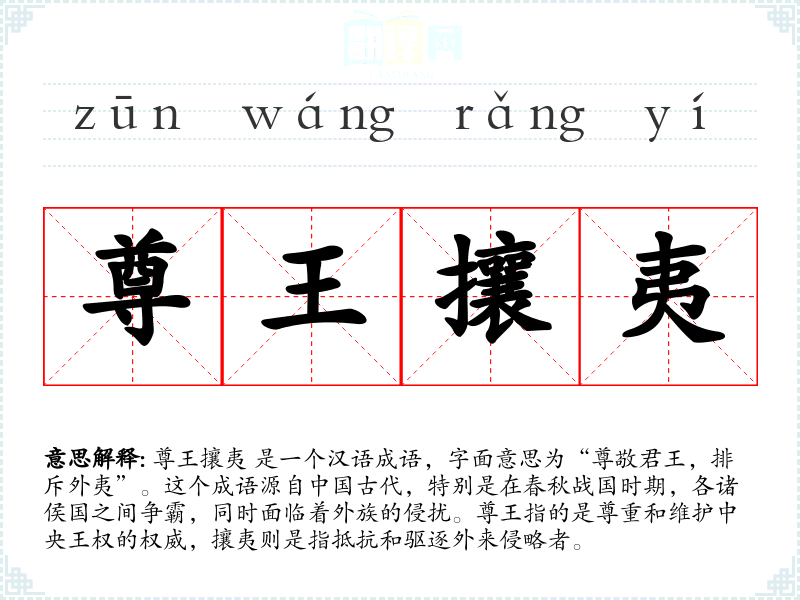 尊王攘夷 是一个汉语成语,字面意思为“尊敬君王,排斥外夷”。这个成语源自**古代,特别是在春秋战国时期,各诸侯国之间争霸,同时面临着外族的侵扰。尊王指的是尊重和维护中央王权的权威,攘夷则是指抵抗和驱逐外来侵略者。
