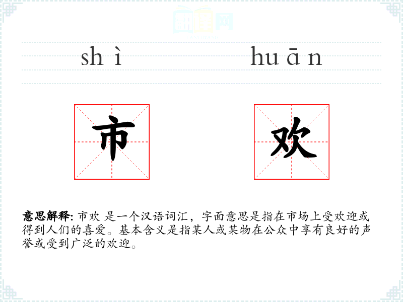 市欢 是一个汉语词汇,字面意思是指在市场上受欢迎或得到人们的喜爱。基本含义是指某人或某物在公众中享有良好的声誉或受到广泛的欢迎。