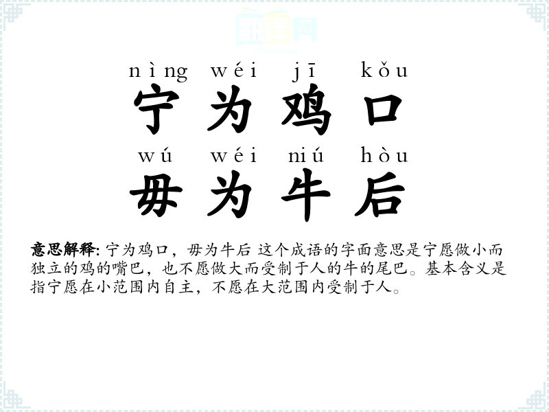 宁为鸡口,毋为牛后 这个成语的字面意思是宁愿做小而独立的鸡的嘴巴,也不愿做大而受制于人的牛的尾巴。基本含义是指宁愿在小范围内自主,不愿在大范围内受制于人。