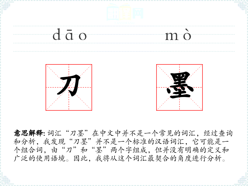 由于“刀墨”不是一个标准词汇,我们无法给出其字面意思和基本含义。它可能是某个特定领域或方言中的词汇,或者是某个特定作品中的创造性用法。