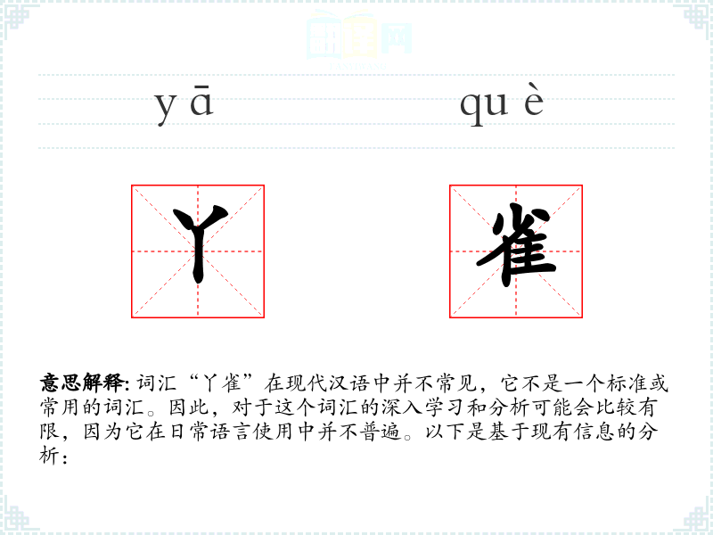 总的来说,“丫雀”这个词汇在标准汉语中并不常见,它的使用和意义可能仅限于特定的方言或社群。对于这个词汇的深入学习和分析需要具体的语境和背景知识。