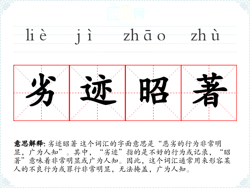 劣迹昭著 这个词汇的字面意思是“恶劣的行为非常明显,广为人知”。其中,“劣迹”指的是不好的行为或记录,“昭著”意味着非常明显或广为人知。因此,这个词汇通常用来形容某人的不良行为或罪行非常明显,无法掩盖,广为人知。