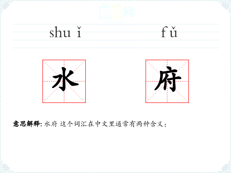- 基本含义:在传统文化和神话中,水府常被用来指代水神或龙王的居所,象征着水的神秘和力量。