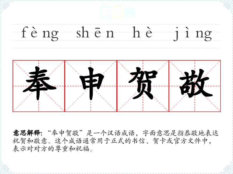 “奉申贺敬”是一个汉语成语,字面意思是指恭敬地表达祝贺和敬意。这个成语通常用于正式的书信、贺卡或官方文件中,表示对对方的尊重和祝福。