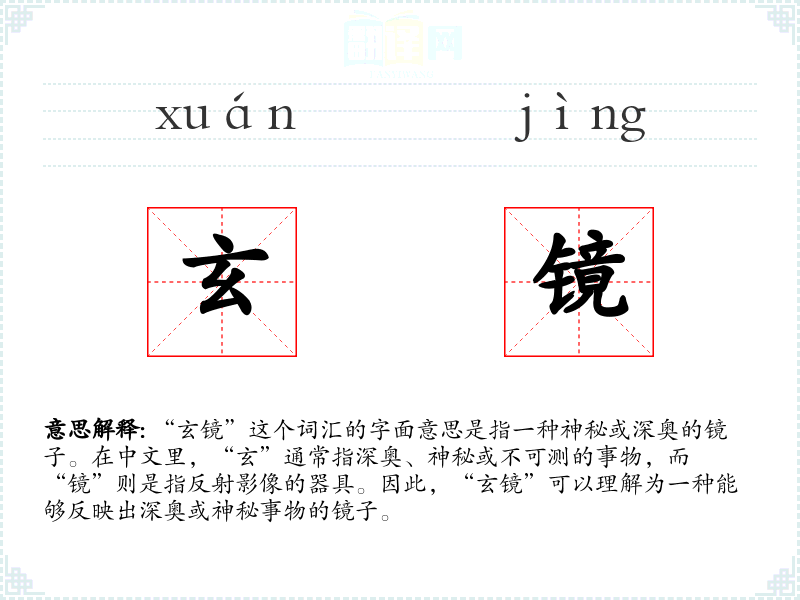 “玄镜”这个词汇在中文中并没有特别古老的词源记录,它更多是在文学和艺术创作中逐渐形成的概念。随着时间的推移,它的含义和用法也在不断丰富和发展。