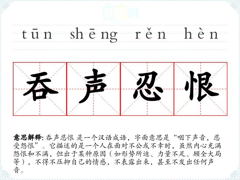 吞声忍恨 是一个汉语成语,字面意思是“咽下声音,忍受怨恨”。它描述的是一个人在面对不公或不幸时,虽然内心充满怨恨和不满,但出于某种原因(如形势所迫、力量不足、顾全大局等),不得不压抑自己的情感,不表露出来,甚至不发出任何声音。