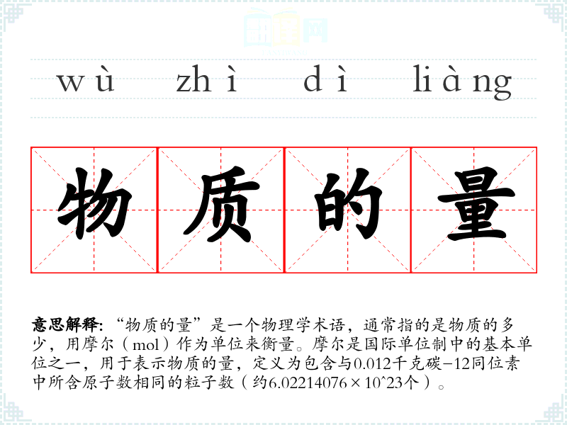 “物质的量”是一个物理学术语,通常指的是物质的多少,用摩尔(mol)作为单位来衡量。摩尔是国际单位制中的基本单位之一,用于表示物质的量,定义为包含与0.012千克碳-12同位素中所含原子数相同的粒子数(约.0221407×10^23个)。