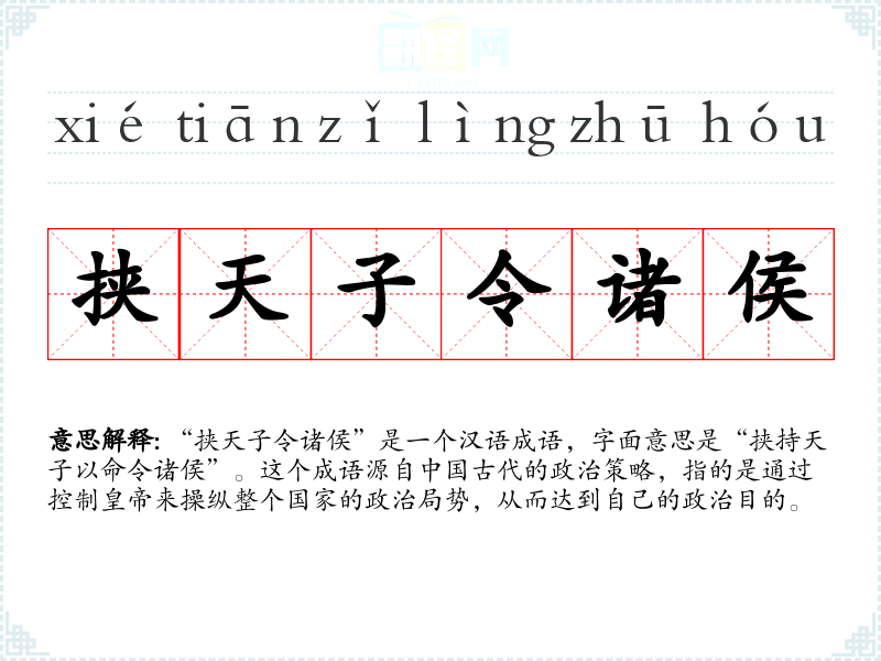 “挟天子令诸侯”是一个汉语成语,字面意思是“挟持天子以命令诸侯”。这个成语源自古代的政治策略,指的是通过控制来操纵整个国家的政治局势,从而达到自己的政治目的。