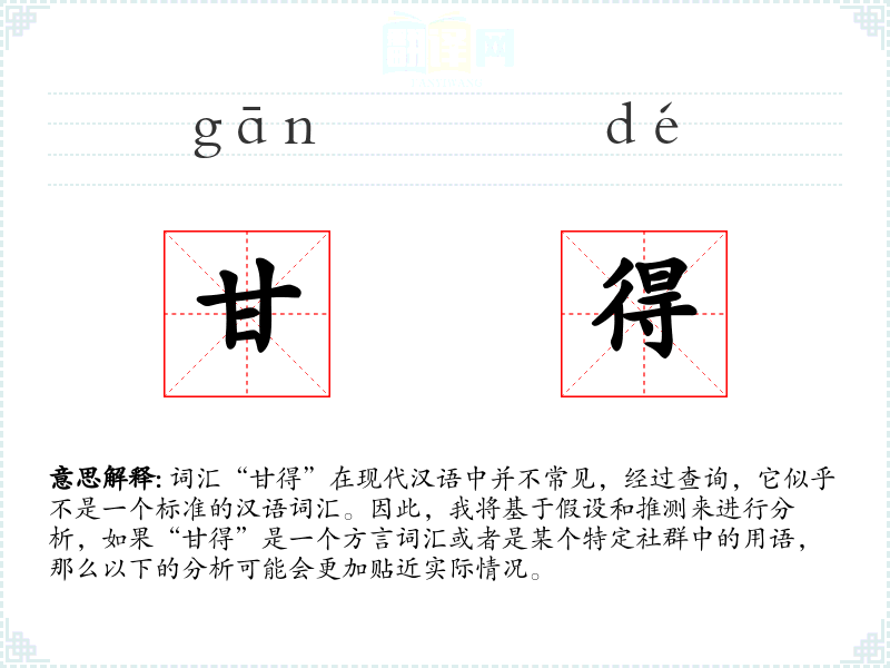 词汇“甘得”在现代汉语中并不常见,经过查询,它似乎不是一个标准的汉语词汇。因此,我将基于假设和推测来进行分析,如果“甘得”是一个方言词汇或者是某个特定社群中的用语,那么以下的分析可能会更加贴近实际情况。
