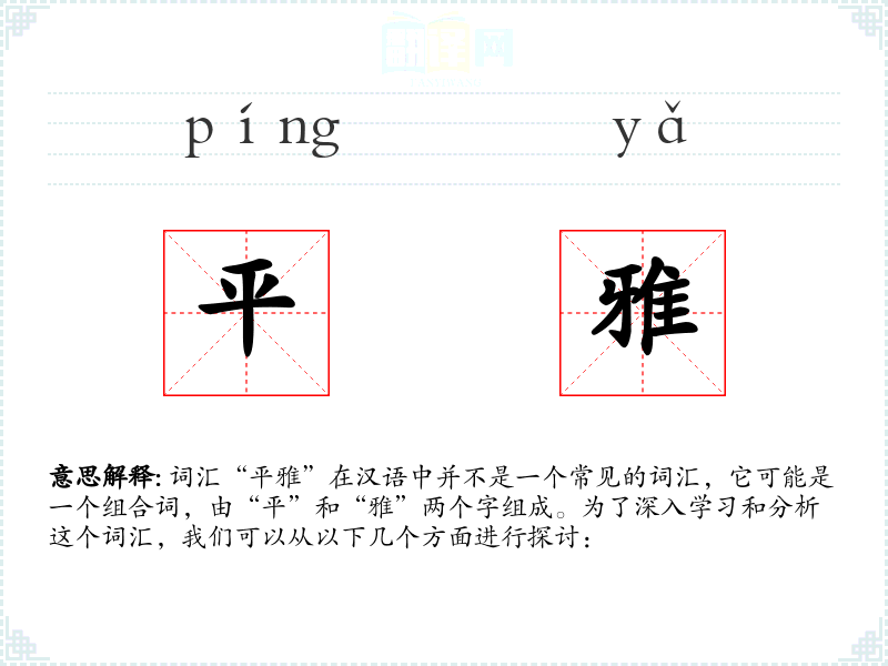 通过对“平雅”这个词汇的分析,我们可以看到它在表达一种平衡和谐、内敛高雅的状态或风格时具有一定的应用价值。在语言学习和表达中,了解和掌握这样的词汇有助于丰富我们的表达方式,提升语言的细腻度和文化内涵。