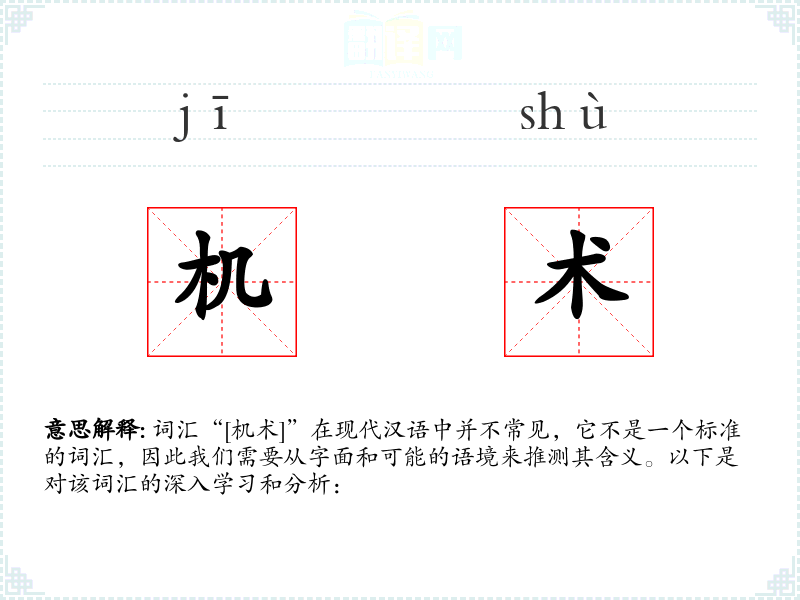 词汇“[机术]”在现代汉语中并不常见,它不是一个标准的词汇,因此我们需要从字面和可能的语境来推测其含义。以下是对该词汇的深入学*和分析: