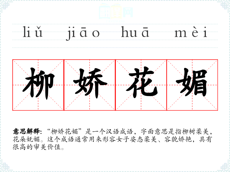 “柳娇花媚”是一个汉语成语,字面意思是指柳树柔美,花朵妩媚。这个成语通常用来形容女子姿态柔美、容貌娇艳,具有很高的审美价值。