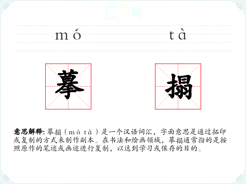 摹搨(mó tà)是一个汉语词汇,字面意思是通过拓印或复制的方式来制作副本。在书法和绘画领域,摹搨通常指的是按照原作的笔迹或画迹进行复制,以达到学*或保存的目的。
