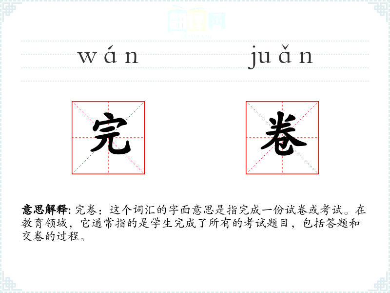 “完卷”一词源于汉语,其中“完”意为完成,“卷”最初指书写用的卷轴,后泛指书籍或试卷。随着教育制度的发展,“完卷”逐渐专指完成考试的行为。
